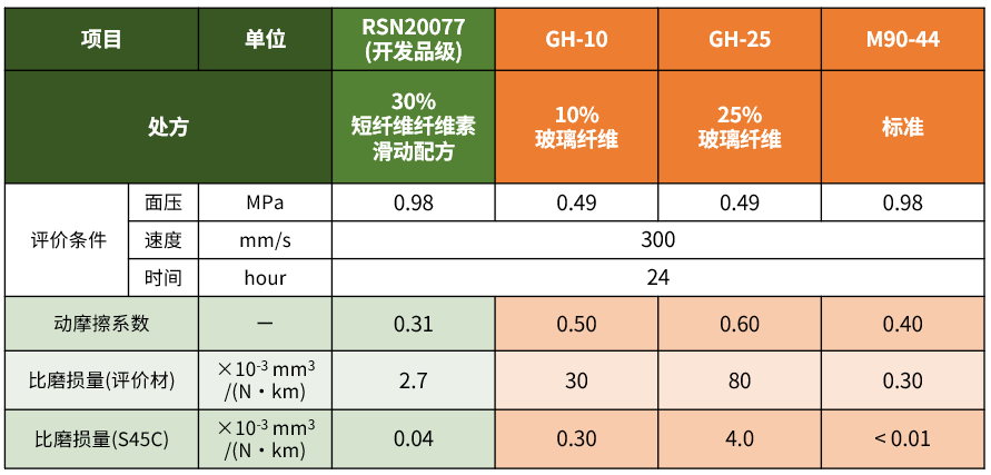 POM的特点是具备出色的滑动特性。但是,POM通过玻璃纤维增强时,在滑动过程中,玻璃纤维容易对配合材料产生磨损,导致难以同时实现高机械物性与良好的滑动特性。但是,采用DURACON POM短纤维纤维素增强品级的情况下,纤维素纤维对配合材料(碳钢、S45C)的磨损较小,从而同时实现高刚性与出色的滑动特性。